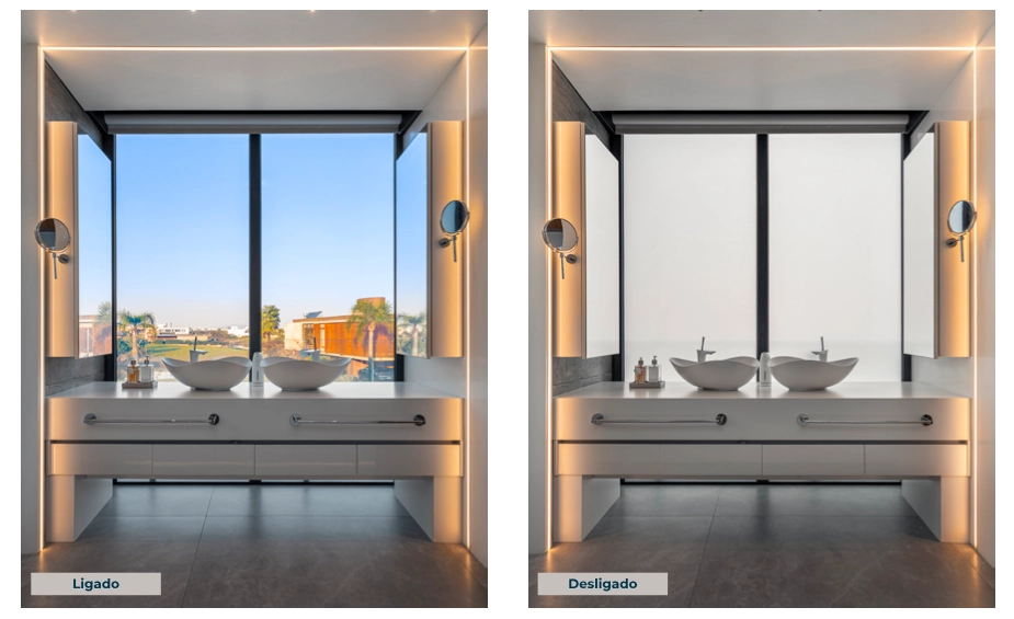 Possui entre as camadas, um filme de cristal líquido alimentado por energia elétrica e controlado através de interruptor.